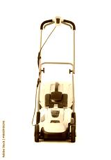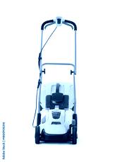 Modern lawn mower on white background