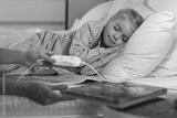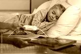 Mother's hands with book turning on electric heating pad under her sleeping little daughter in bedroom at night