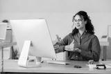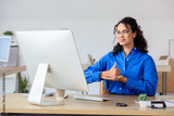 Young African-American businesswoman using sign language while video chatting in office