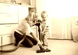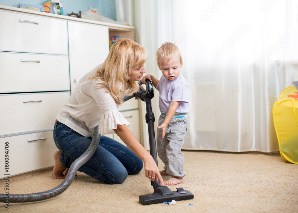 Cleaning up the room together - mother and her kid son with vacuum cleaner