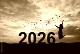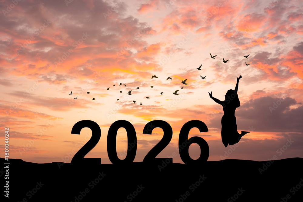 Young woman enjoying and celebrating New Year 2026 with the dramatic sky and beautiful sunset over the tranquil beach