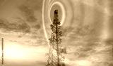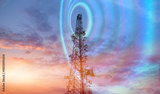 Antenna tower of telecommunication and Phone base station with TV and wireless internet antennas at sunset