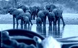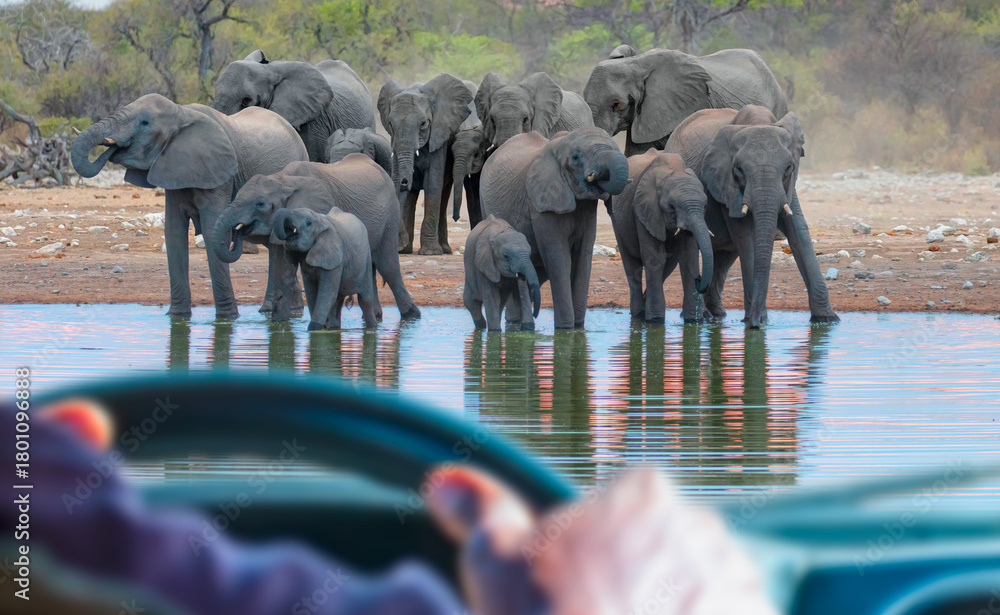 African man in a car driving 4x4 car on safari trip - Amazing african elephants at sunset concept - African elephants standing near lake in Etosha National Park, Namibia