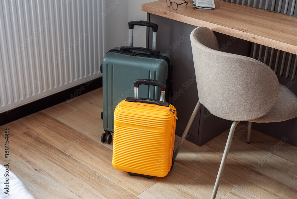 Two suitcases standing in modern hotel room for travel