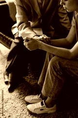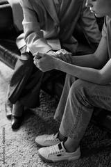 Middle aged Caucasian woman holding hands of young adult Caucasian woman during counseling session, both sitting on sofa, therapist providing emotional support in psychological context
