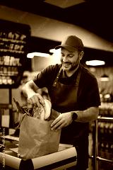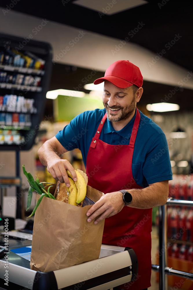 Happy supermarket cashier packing goods in paper bag at cash register.
