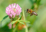 A bee is flying over a pink flower