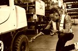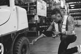 Warehouse worker wearing a safety vest checking a forklift tire with a clipboard and paper, representing safety inspection, maintenance, and quality control in industrial and logistics operations