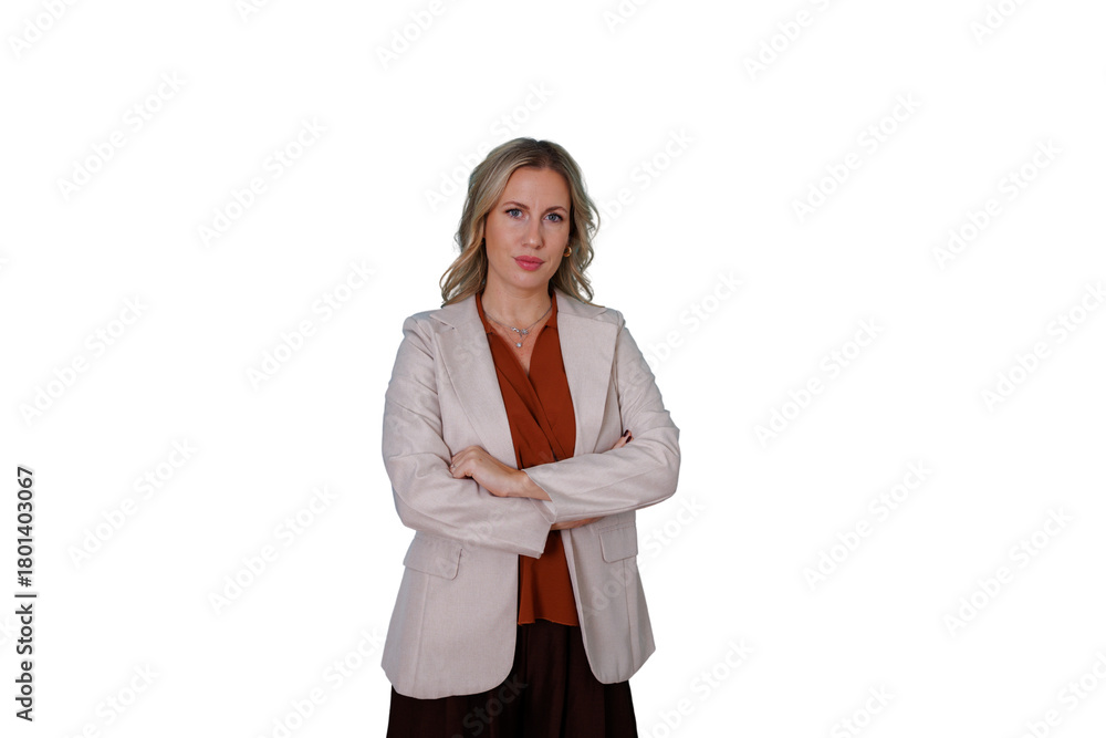 Confident businesswoman with arms crossed standing, demonstrating power and leadership on transparent background