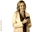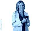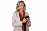 Businesswoman standing, smiling, texting on phone, managing work, communication, digital nomad, transparent background