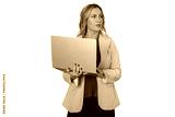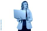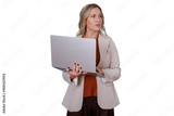 Professional woman holding laptop, concentrating on work, standing with smart business attire, transparent background