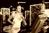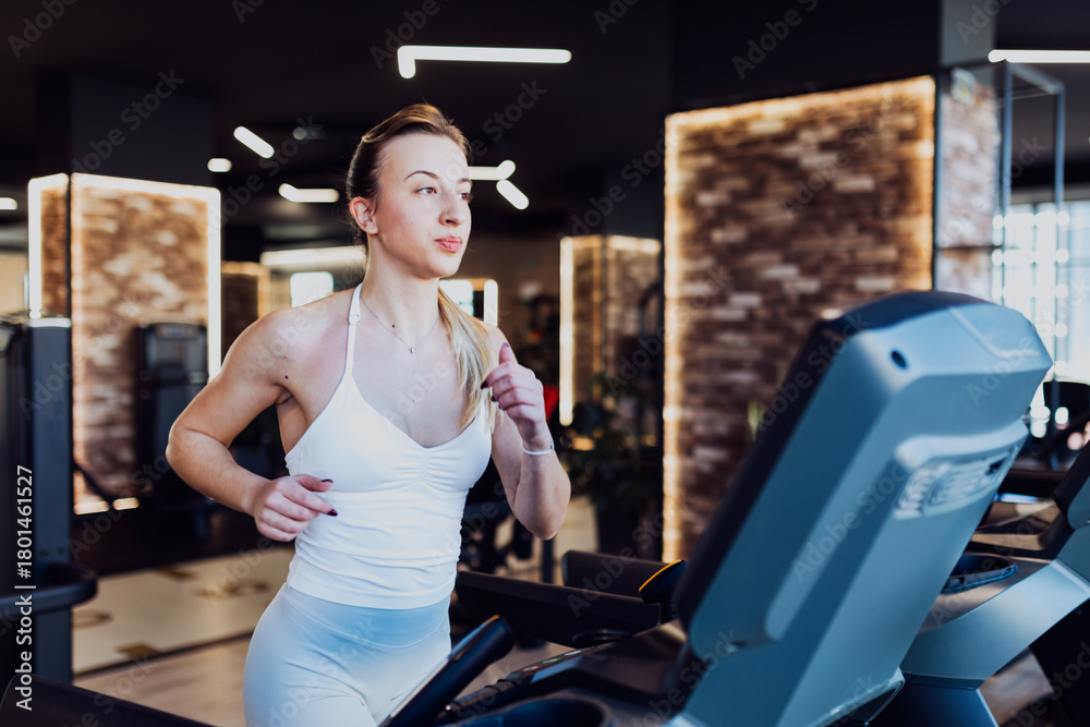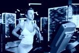 A fit young woman with blue hair running on a treadmill in a modern gym. She is focused on her workout