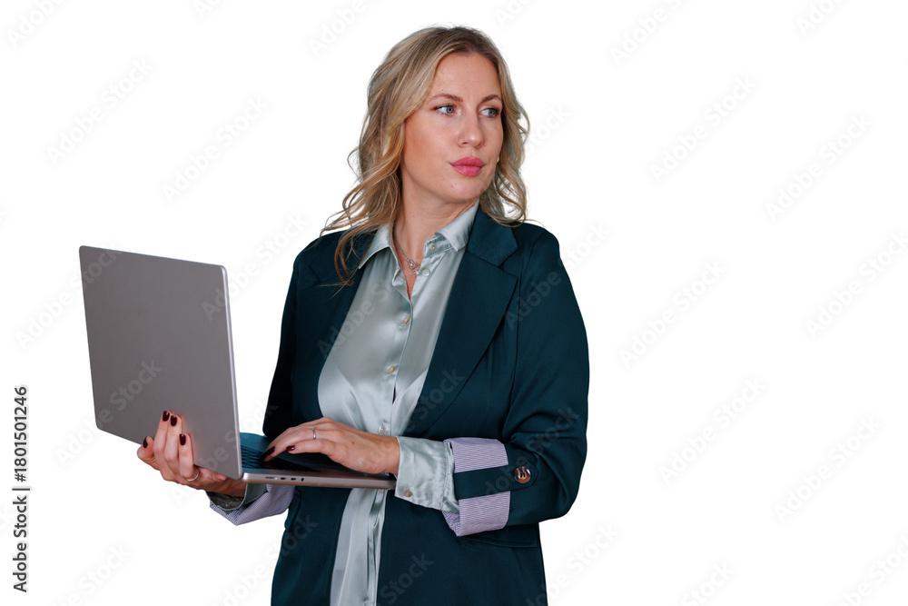 Professional businesswoman in formal wear holding laptop, looking away, with transparent background, technology concept