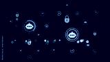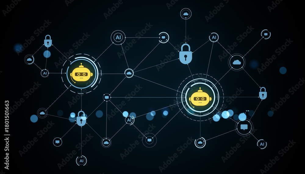 Futuristic network of chatbot and cloud icons with security locks, connected in digital mesh on dark abstract background with glowing blue light dots. 3D Rendering