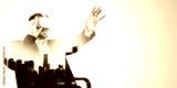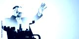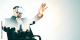Businessman wearing virtual reality headset interacting with VR environment over cityscape double exposure on light background.