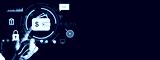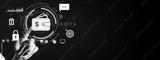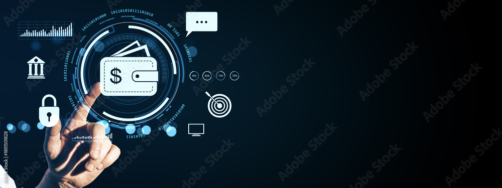 Digital hand interacts with virtual wallet icon surrounded by futuristic financial and blockchain symbols on dark background with blue light effects.