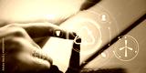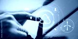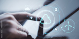 Hand interacting with digital tablet showing recycling and eco-friendly icons on light background with creative environmental technology concept.