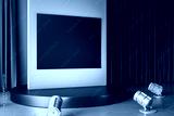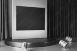 Blank vertical screen on round stage platform with spotlights and curtains in presentation room setup. Clean modern branding display concept. 3D Rendering