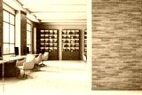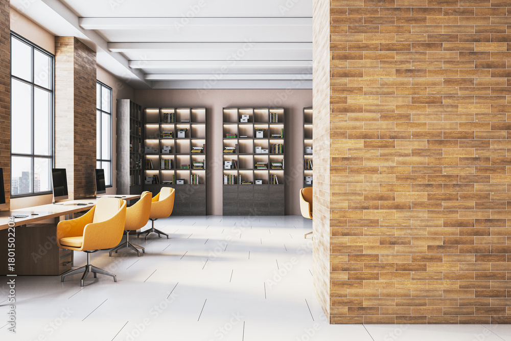 Modern office interior with blank brick wall and workspace featuring yellow chairs, computers, and bookshelves in clean corporate design. 3D Rendering