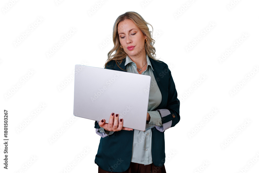 Confident businesswoman holding an open laptop, using technology for work, focusing on business and productivity