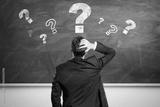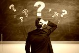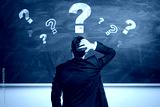 Confused man in suit standing before green chalkboard with floating question marks symbolizing curiosity, problem-solving, and education concept.