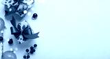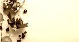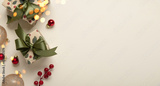 Merry Christmas and Happy Holidays greeting card, frame, banner. New Year. Christmas ornaments and gifts, presents on light beige background top view. Winter xmas holiday festive theme.