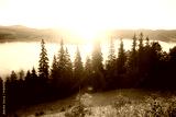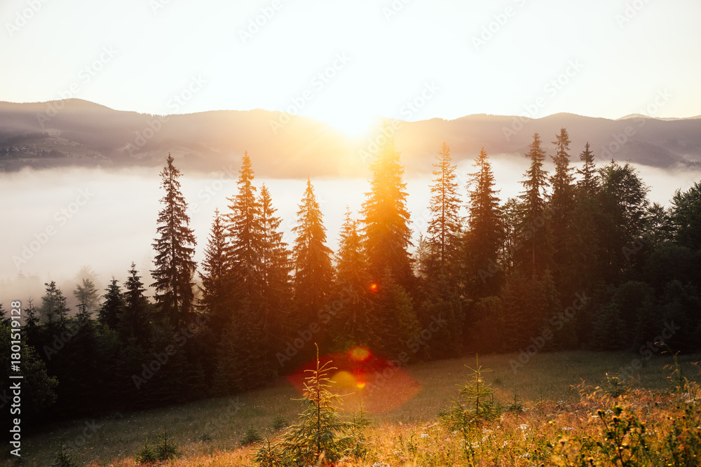 Sunrise over misty mountains casts a golden glow over evergreen coniferous trees in a tranquil valley creating a feeling of harmony.