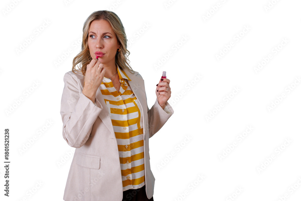 Blonde woman applying lip gloss, enjoying beauty routine, preparing makeup on transparent background