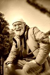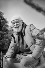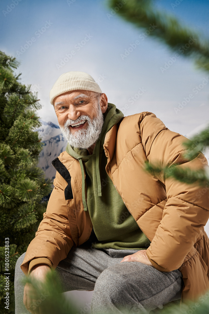 Senior man enjoying a joyful winter moment surrounded by greenery and snow capped mountains