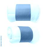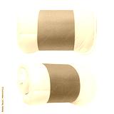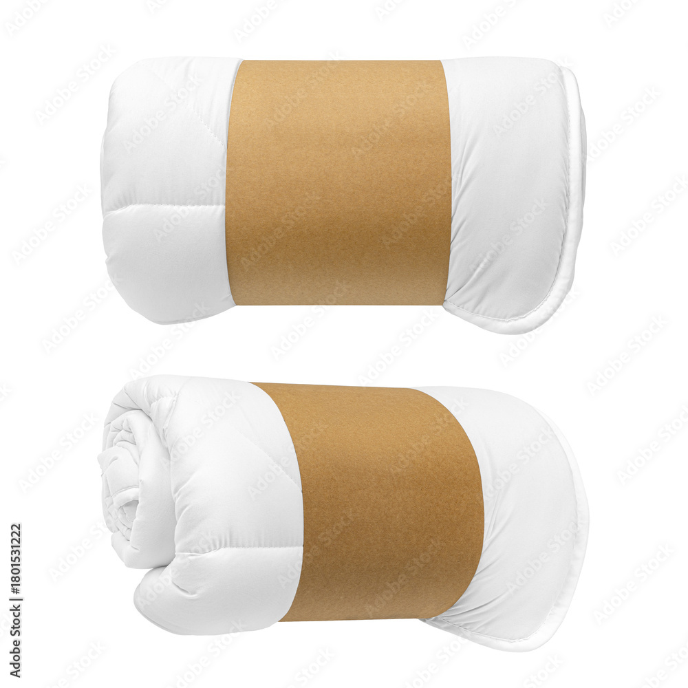 Rolled white quilted blanket or comforter tied with a blank kraft paper band, isolated on a white background. Texture of quilted fabric.Perfect for textile and bedding mockups, packaging, store design