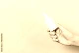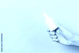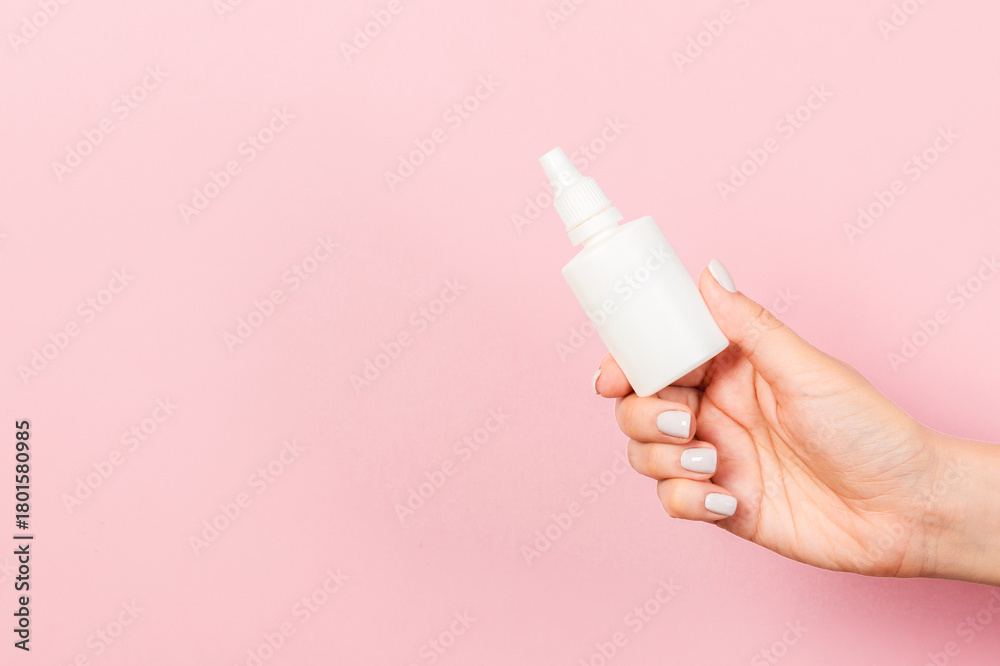 Female hand holding cream bottle of lotion isolated. Girl give tube cosmetic products on pink background
