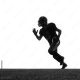 American football player running with determined emotion on field isolated on white background. Concept of sport action, athlete promotion, body in motion, fitness materials.