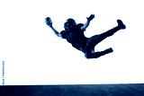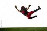 American football player diving horizontally with energetic emotion isolated on white background. Concept of dynamic action, sport advertising, athlete performance visuals.