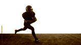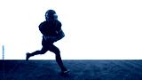 American football runner sprinting forward with powerful determination. Concept of training guides, sport apps, coaching materials, marketing visuals, performance analysis.