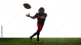 Football player catching descending ball with concentrated emotion. Concept of skill training, body in motion, coaching slides, sport education, app mockups, advertising layouts.
