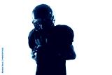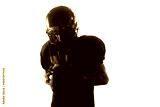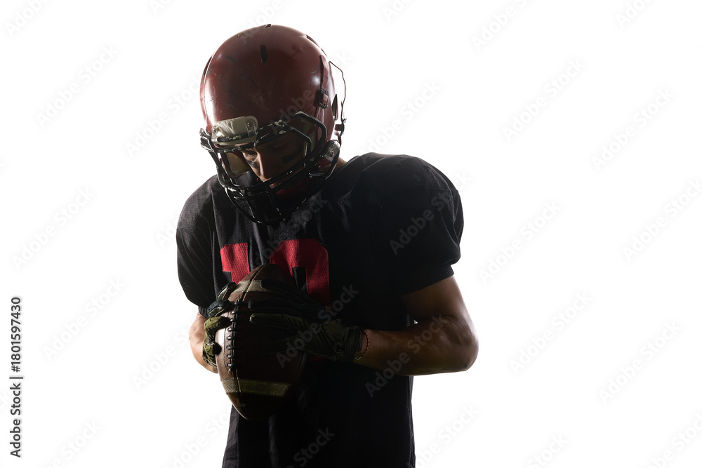 Football player holding ball closely with emotional concentration. Concept of mental strength training, motivation visuals, sport education, team presentations.