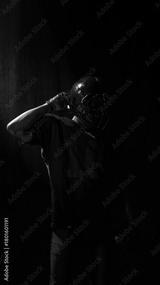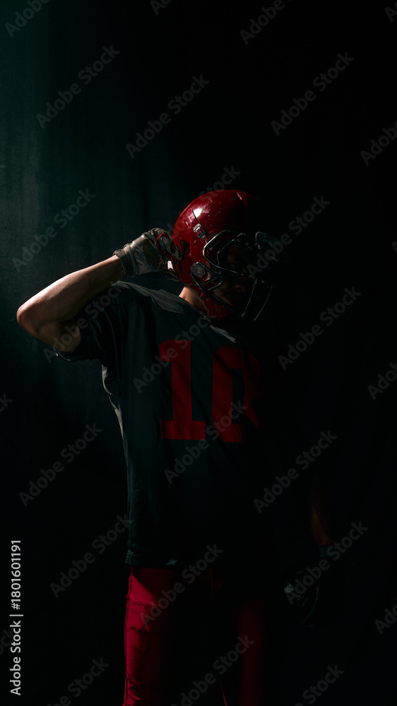 American football player adjusting helmet with strong emotional concentration. Concept of mindset preparation, sport psychology visuals, coaching materials, branding use.