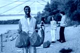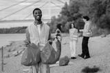 Portrait of smiling male volunteer in a safety vest holding trash bags during a community environmental cleanup event.