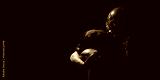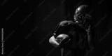 American football player holding ball with emotional fatigue in dramatic low light. Concept of recovery education, mindset training, editorial sport content, branding materials.