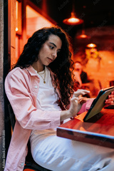 Happy woman browses tablet while smiling, expressing emotional connection, positive interaction with digital media and autonomy in remote working environment.