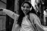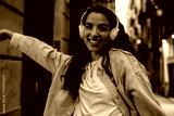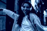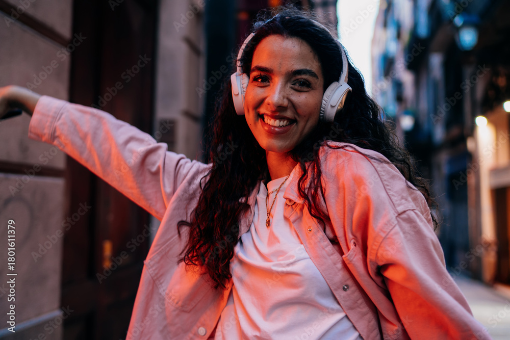 Close-up of smiling woman in headphones with raised arm, radiating joy, tech-powered confidence and vibrant personal expression in urban digital culture.