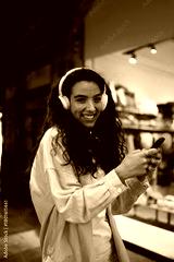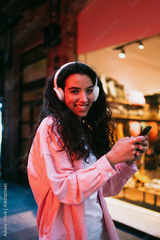 Woman looks back while walking past store, smiling with headphones and smartphone, reflecting relaxed independence, personal rhythm and confident tech-savvy femininity.