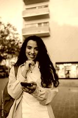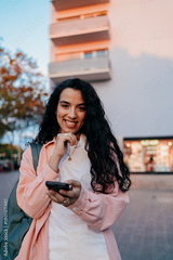 Confident woman smiles while holding smartphone, immersed in urban tech routine, showing connection, mobile autonomy and modern lifestyle anchored in daily digital interaction