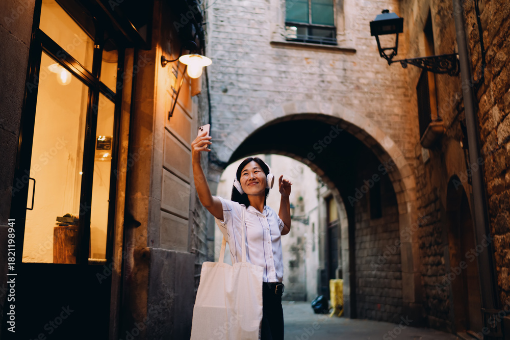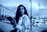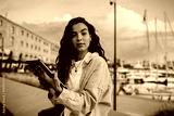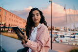 Young woman looks at camera holding tablet, framed by sunset-lit harbor, representing quiet tech power, emotional clarity and stylish independence in mobile work life.