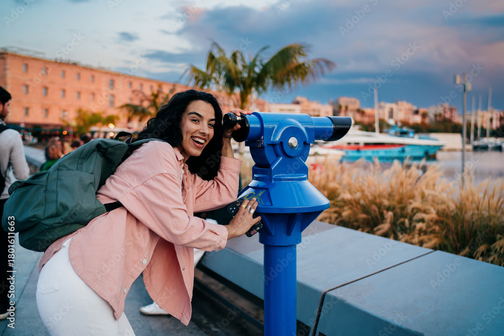 Laughing young woman leans on bright viewer, blending joyful energy, digital spontaneity and emotional presence while exploring surroundings through urban tech.