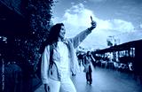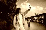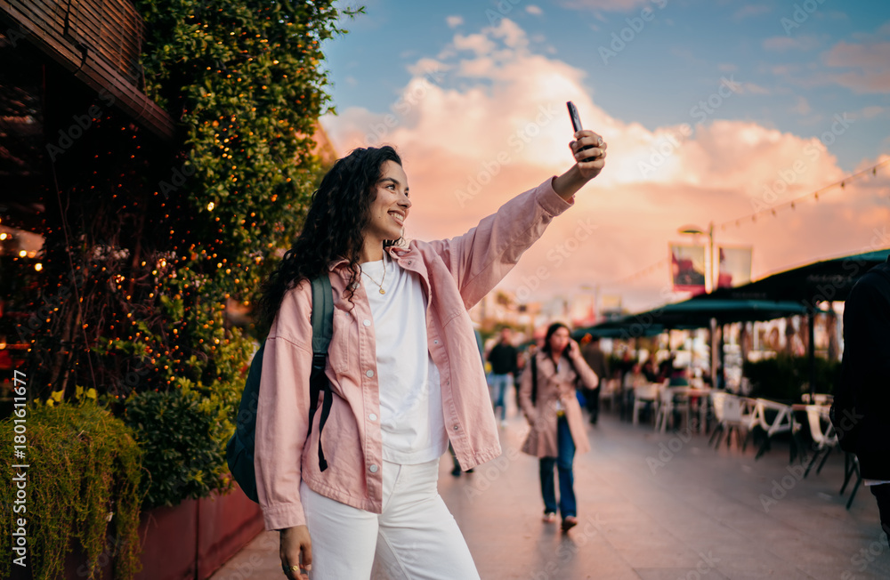 Young woman smiles while taking selfie, capturing personal confidence and digital self-expression in real time with mobile device on lively street at golden hour.