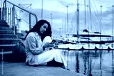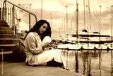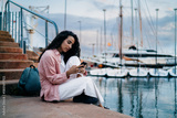 Young woman sits on dock browsing smartphone, immersed in quiet concentration and private tech flow, surrounded by peaceful harbor while embodying personal mobile autonomy.