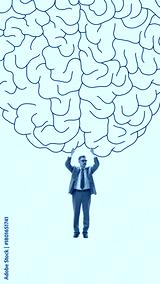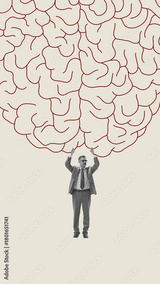 Minimal composition of businessman holding giant red brain outline with emotional strain. Concept of thinking overload, pressure, responsibility and mental work.