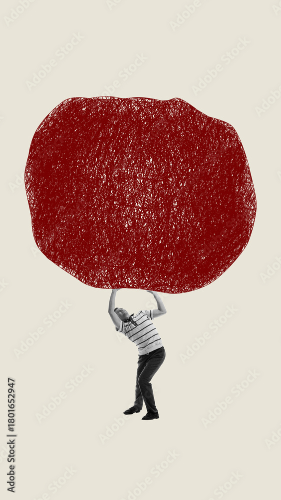 Striking collage of man lifting massive red chaotic weight with emotional determination. Concept of effort, resilience, challenge, overload and personal strength.