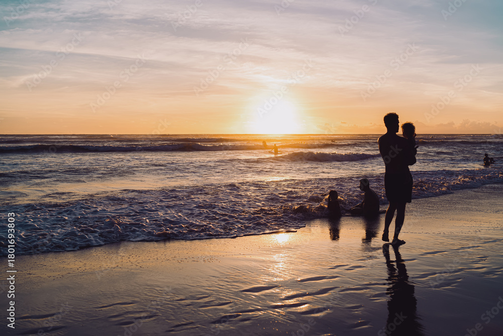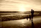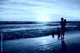 Father holding child by the sea during sunset, surrounded by silhouettes in warm golden light. The image conveys family love, reflection, and emotional connection within a serene natural landscape